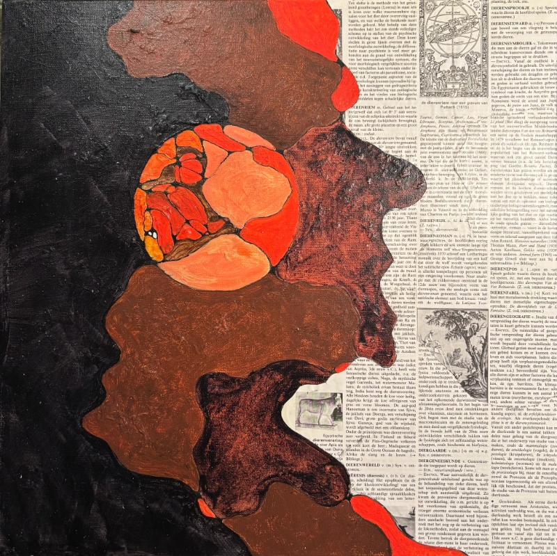 Techniek: Acrylverf, fineliner en encyclopedie collage
